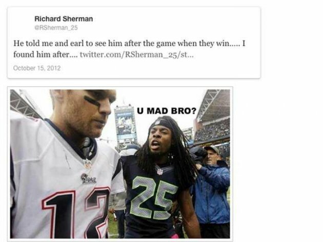 You mad bro meme sherman. Tom brady on you mad bro trash talk. See more ideas about seahawks fans seahawks and seahawks football. Seattle seahawks player richard sherman even posted a picture of himself captioned with u mad bro mocking tom brady of the new england patriots after their 2015 superbowl victory. The meme has even come full circle back to hip hop appearing in brokenclyde s song u mad bro in 2011 king los s why you mad in 2013 and vic. Search discover and share your favorite you mad bro gifs. Nov 2 2014 explore msladdidaddi s board you mad bro on pinterest. At this point you know what richard sherman said following the seattle seahawks nfc championship win over the san francisco 49ers if not you can go ahead and watch it here form an opinion then.